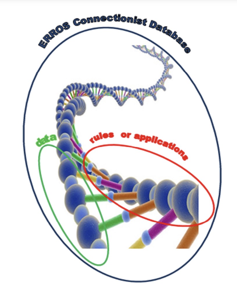 With traditional application development methods, data are put in tables and the rules that govern that data are coded in programs. These separatist worlds of data and programs have to be kept in synchronisation, at best a fragile process. ERROS is the first computer environment in which the database definitions, the application definitions and the user data are totally integrated, stored in the unique ERROS Connectionist database (CDb). This might be compared to the structure of the DNA string in which both sides are related but independent and are interconnected to form one integrated whole.