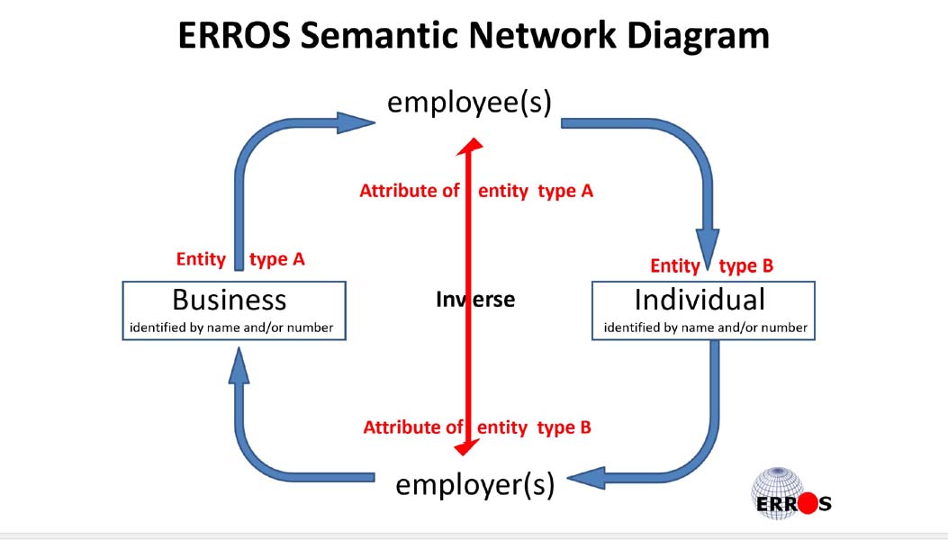 This ERROS Semantic Network Diagram ilustrates how the connection between a business and its employees is defined in the ERROS Ontology.